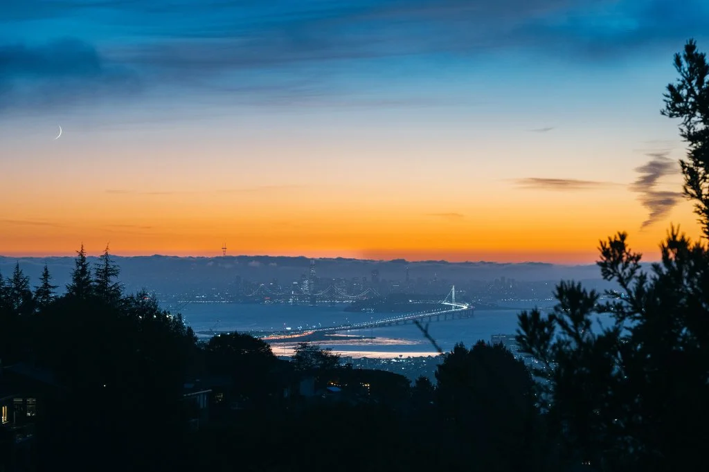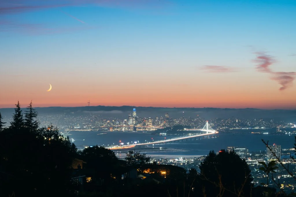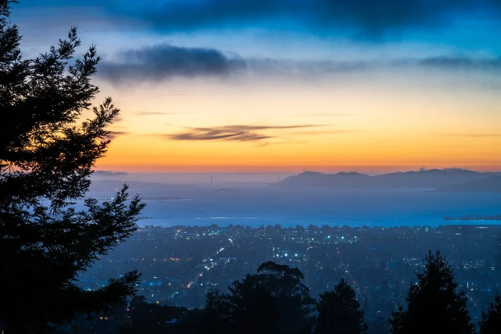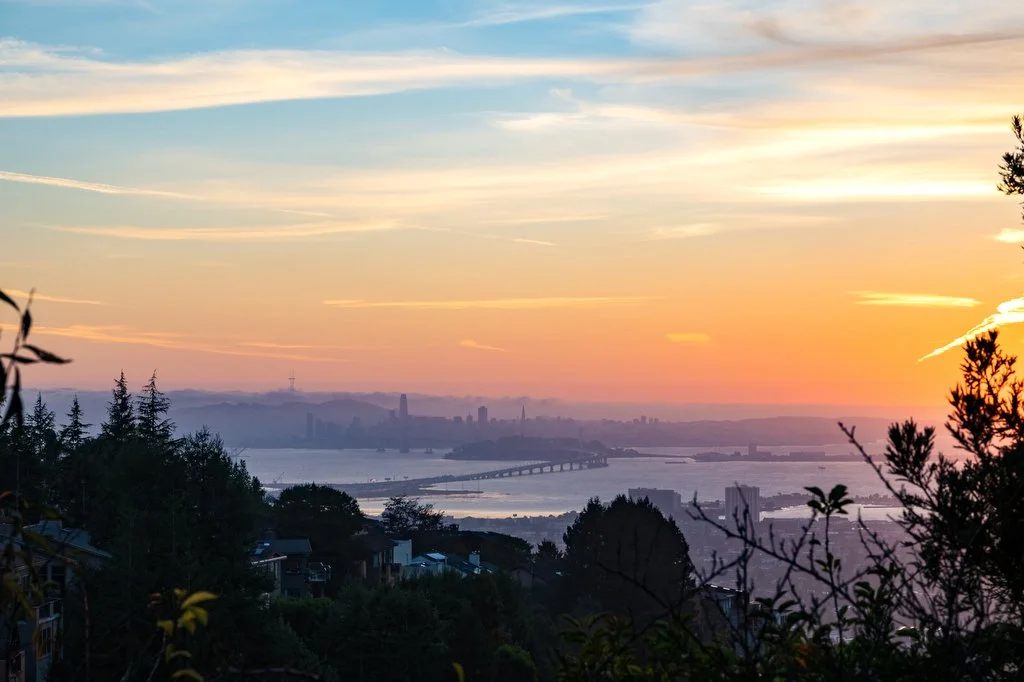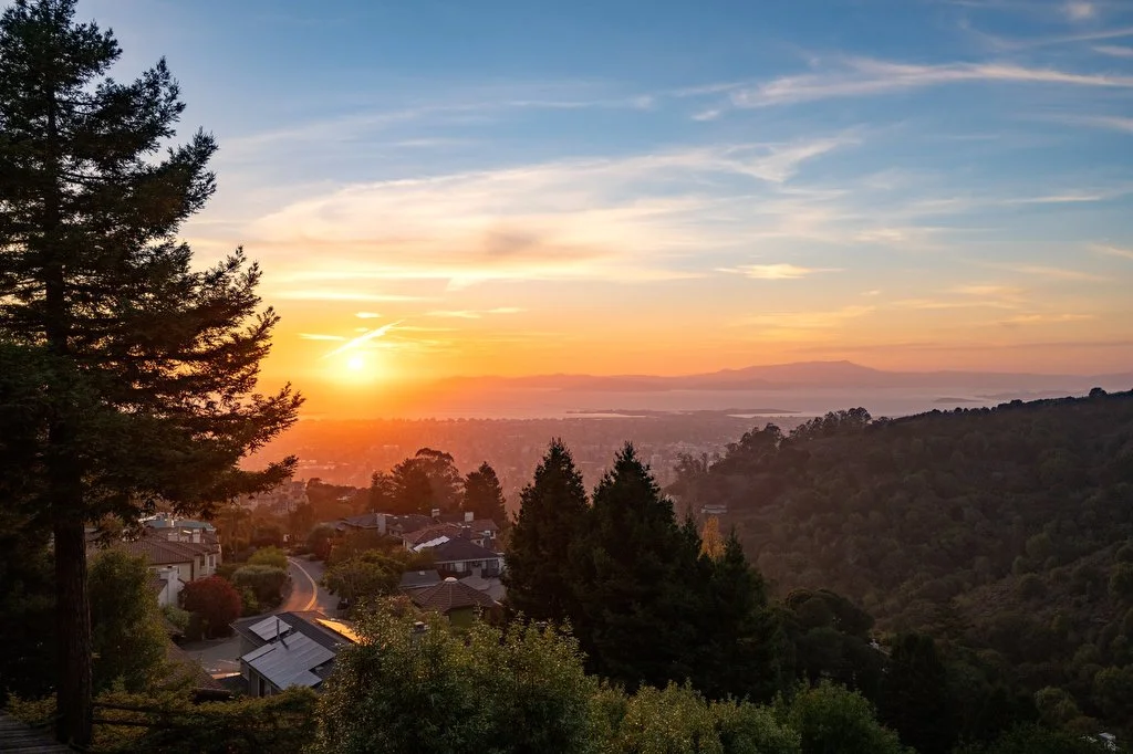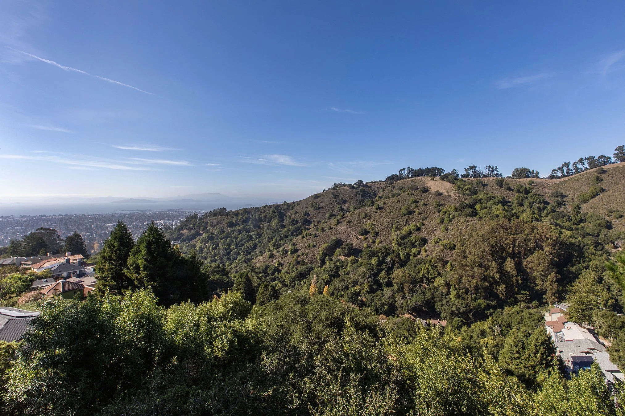 Scenic view of a neighborhood surrounded by trees on rolling hills, with the city and bay in the distance under a clear blue sky.