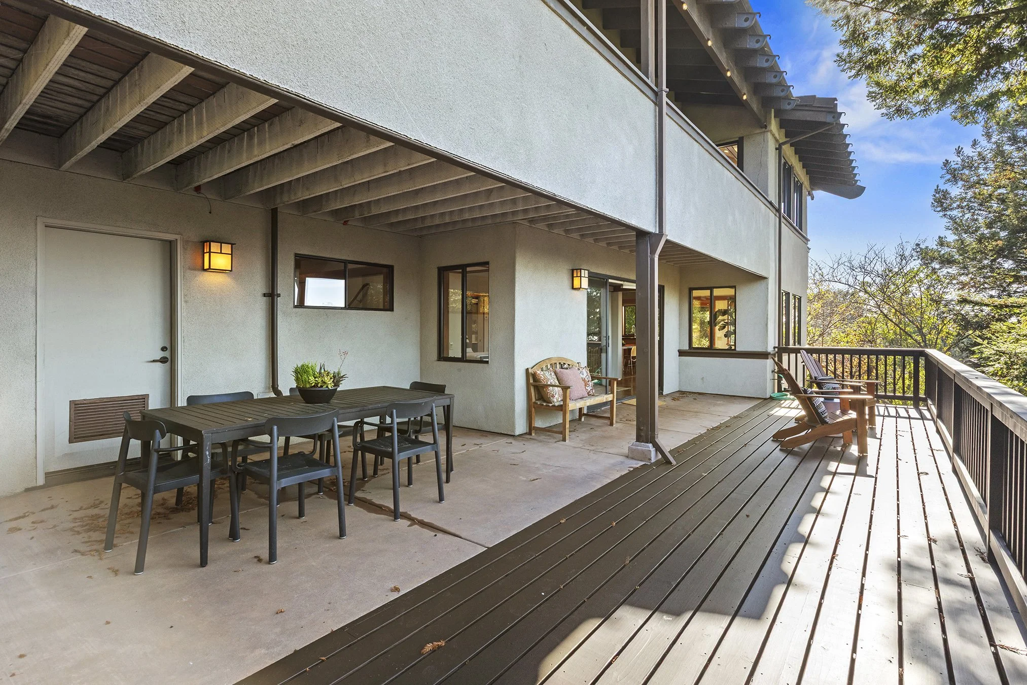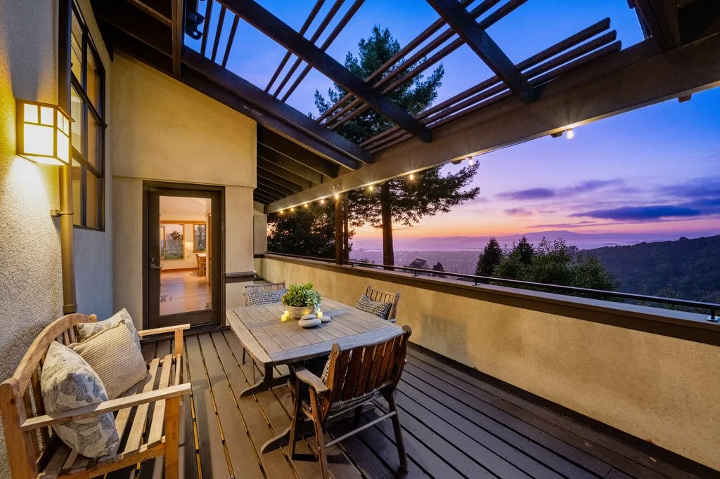A spacious outdoor balcony with wooden flooring, a dining table with chairs, and string lights overhead. The balcony overlooks a scenic view of trees and distant cityscape.
