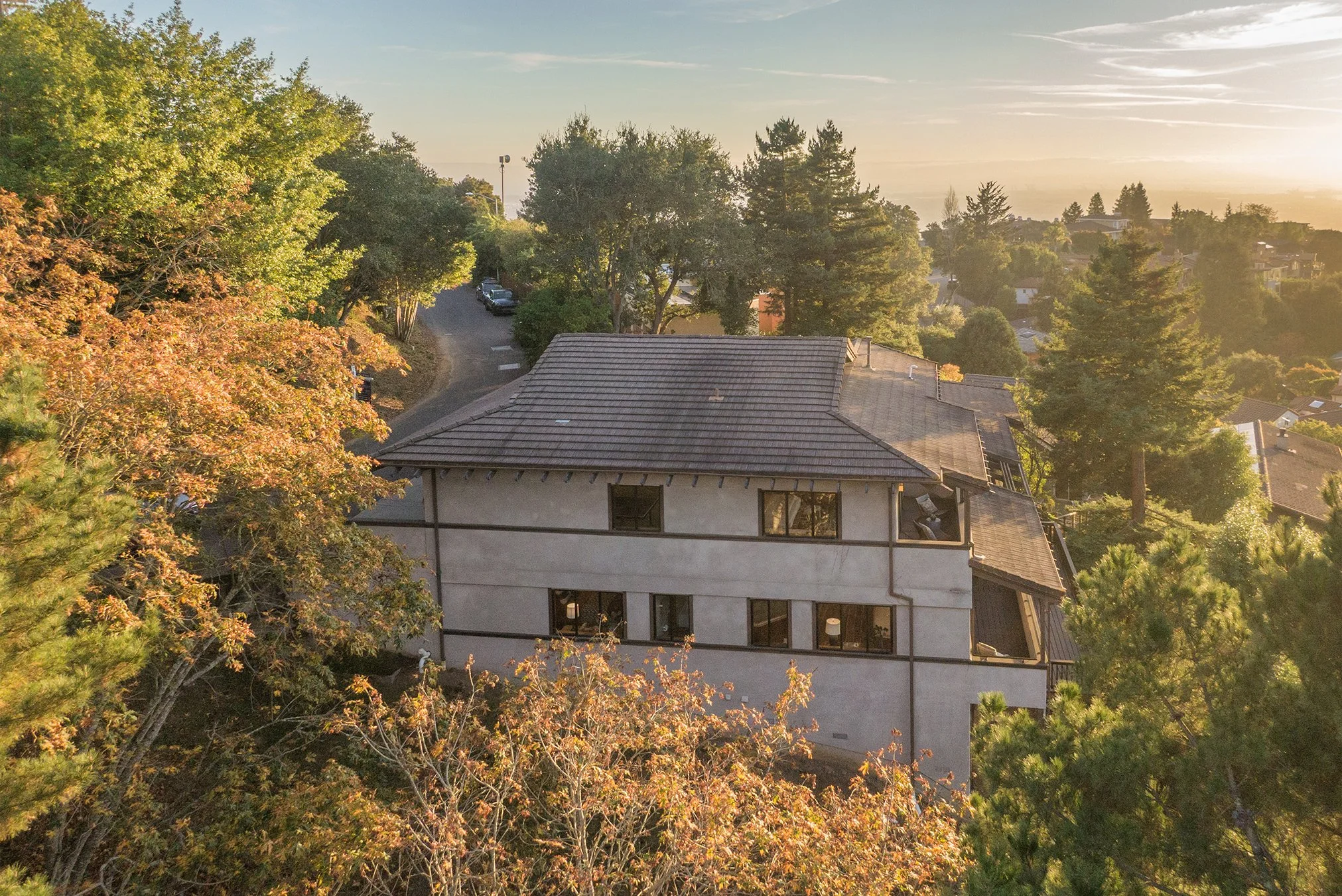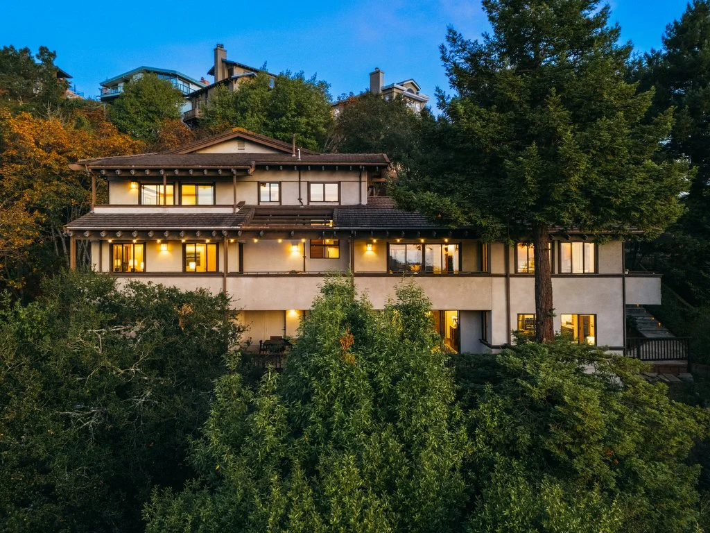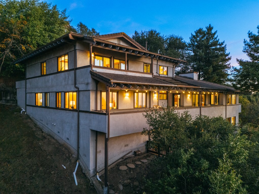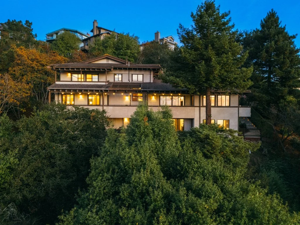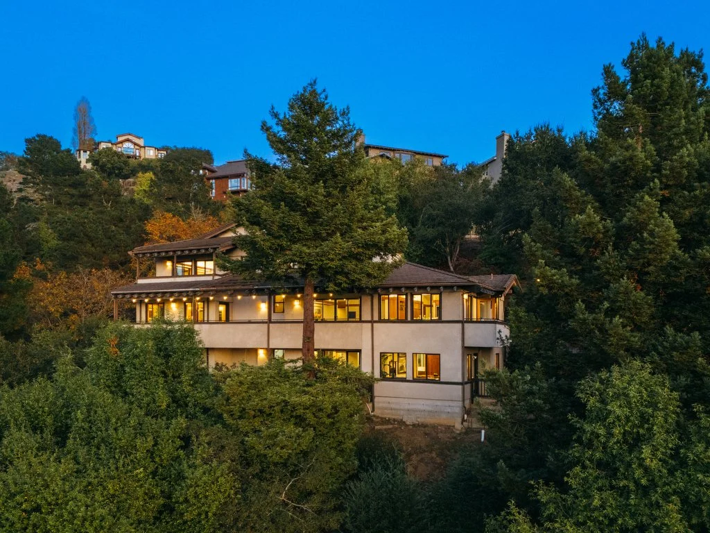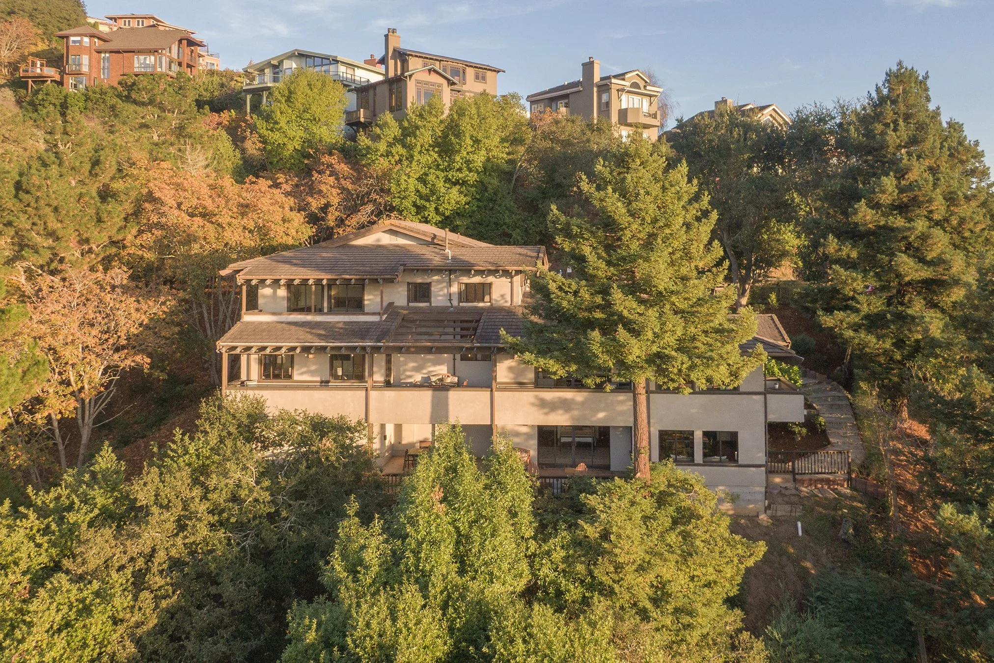 A multi-story house on a hillside surrounded by trees and other houses in the distance.