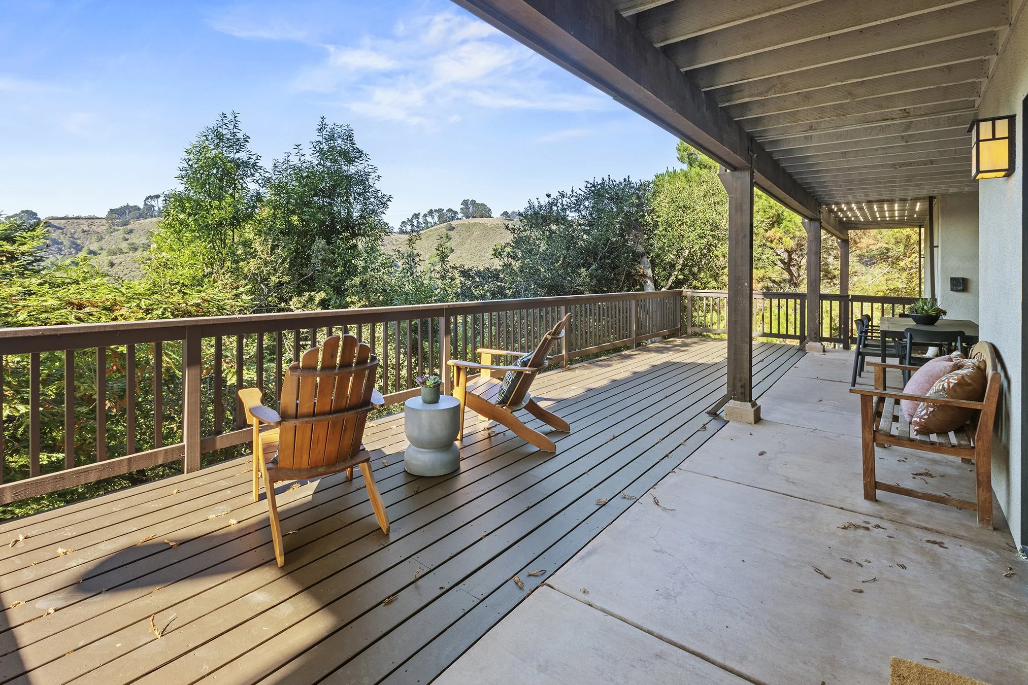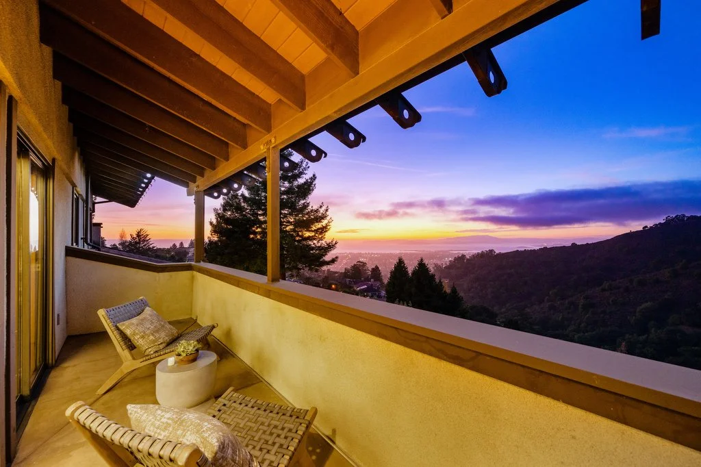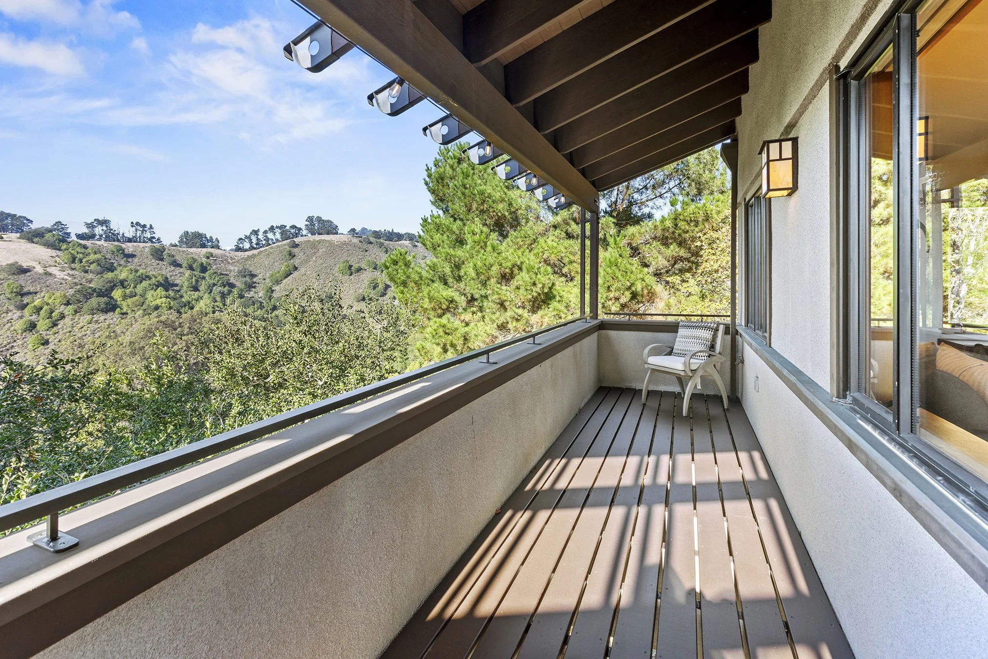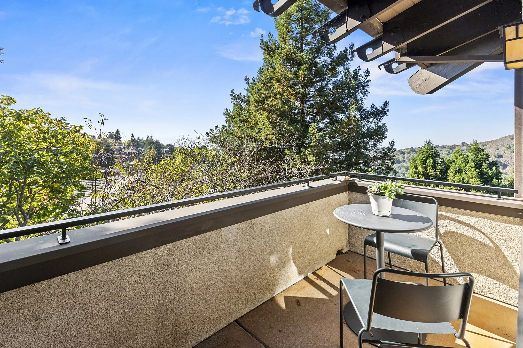 A balcony with outdoor furniture overlooking a scenic view of trees and hills under a partly cloudy sky.