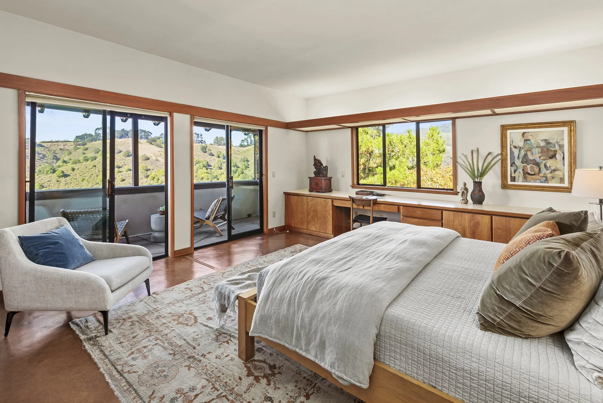 Spacious bedroom with large sliding glass doors leading to a balcony with Adirondack chairs, overlooking green hills and trees, decorated with a cream rug, white bedding, striped pillows, and wooden accents.