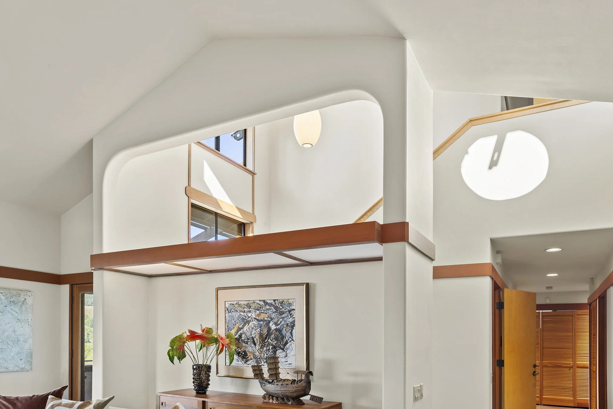 Interior of a modern home with white walls, wooden accents, and artwork. A pendant light hangs from the ceiling, and a wooden table holds a bouquet of flowers and a boat sculpture. Windows and doors are visible in the background.