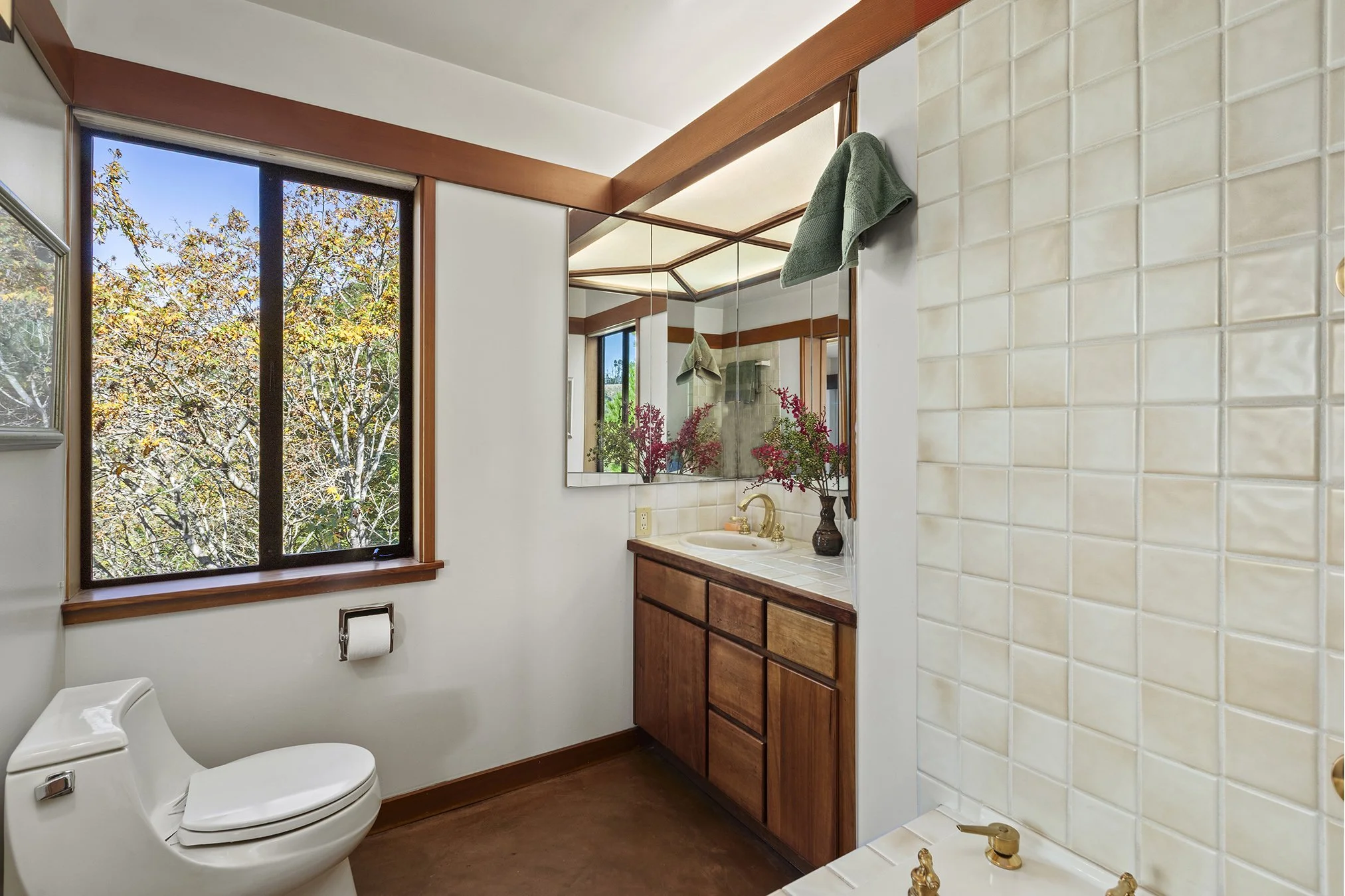 Bathroom with a large mirror, beige tiled countertop with a white sink, wooden cabinetry, a window with a view of trees, and a toilet. View fullsize