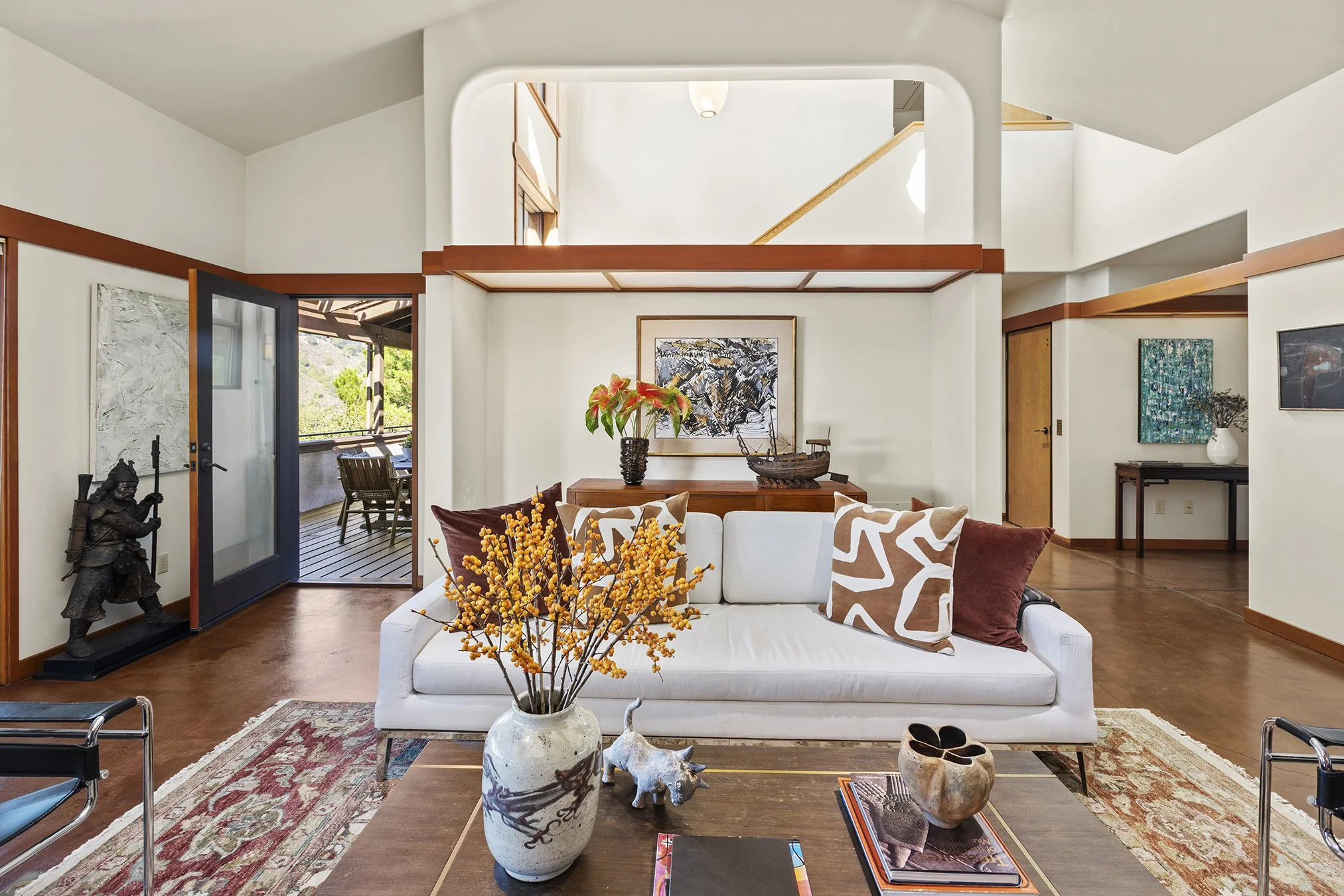 Interior of a modern home with white walls, wooden accents, and artwork. A pendant light hangs from the ceiling, and a wooden table holds a bouquet of flowers and a boat sculpture. Windows and doors are visible in the background. View fullsize