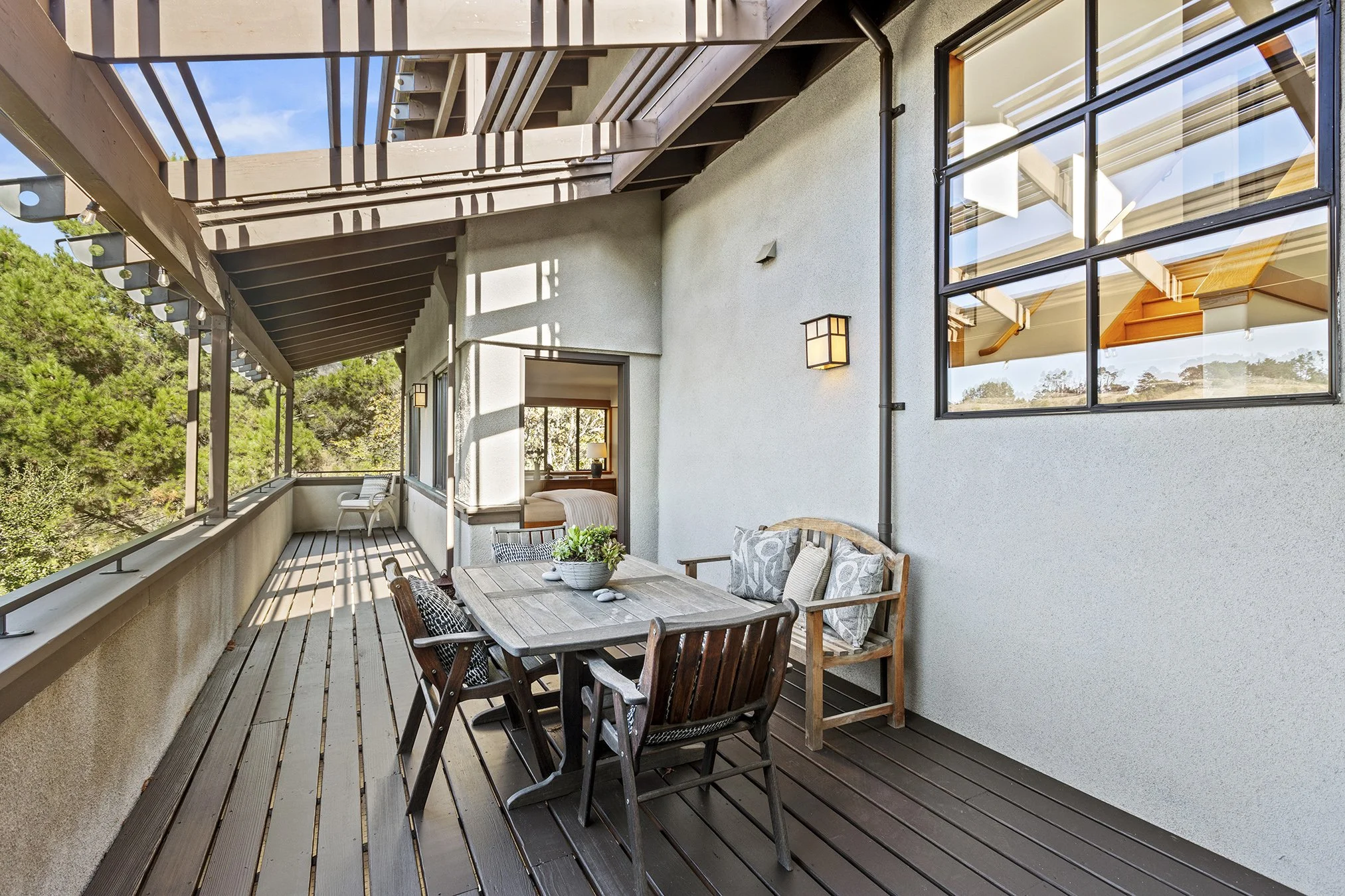 Outdoor balcony with wooden flooring, patio furniture including a table and chairs, and a view of surrounding trees.