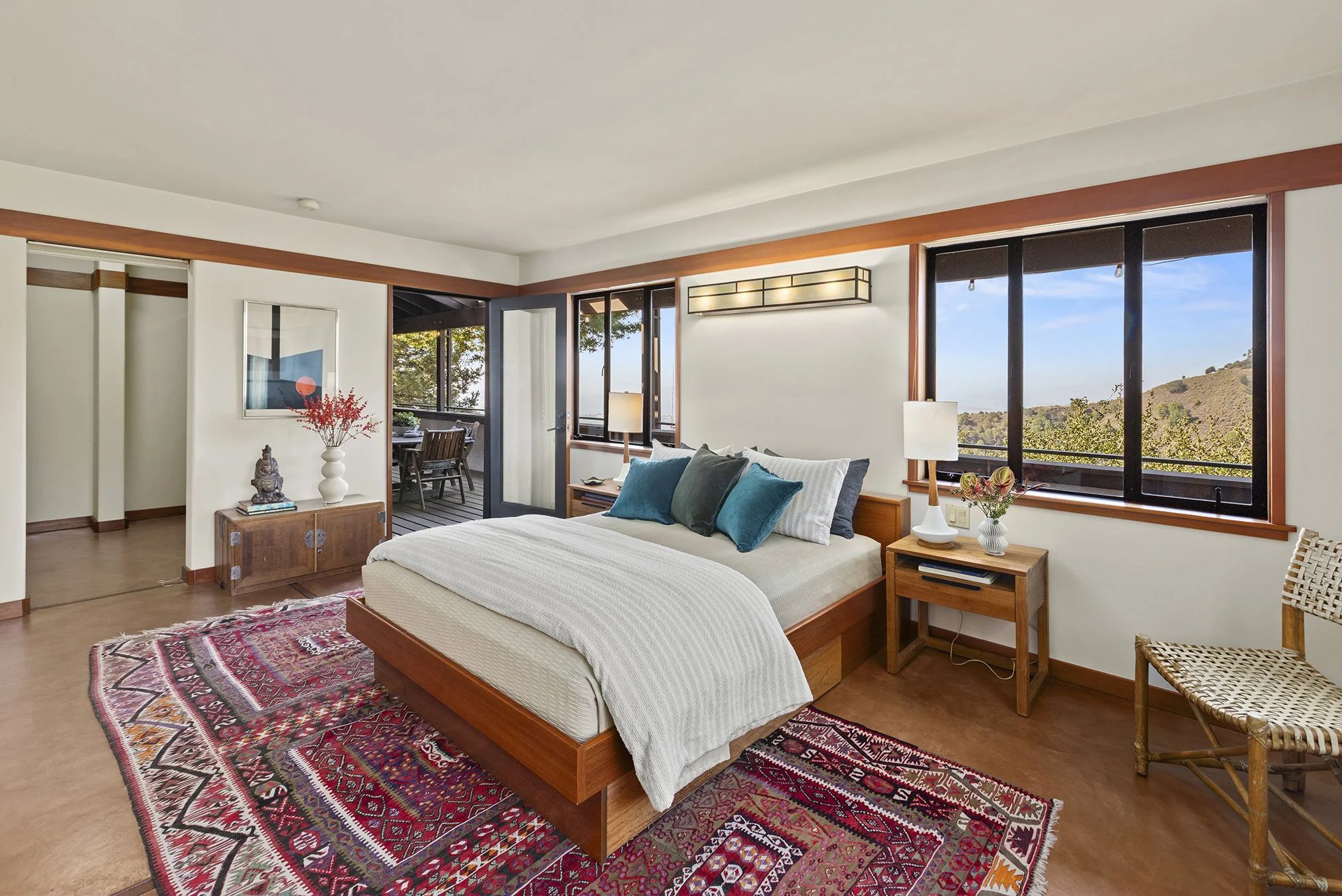 A bright bedroom with large windows showing a hillside view outdoors. The room features a wooden bed with pillows, a nightstand with a lamp, a dresser with vases and lamps, a rug, and a chair, with white walls and ceiling.