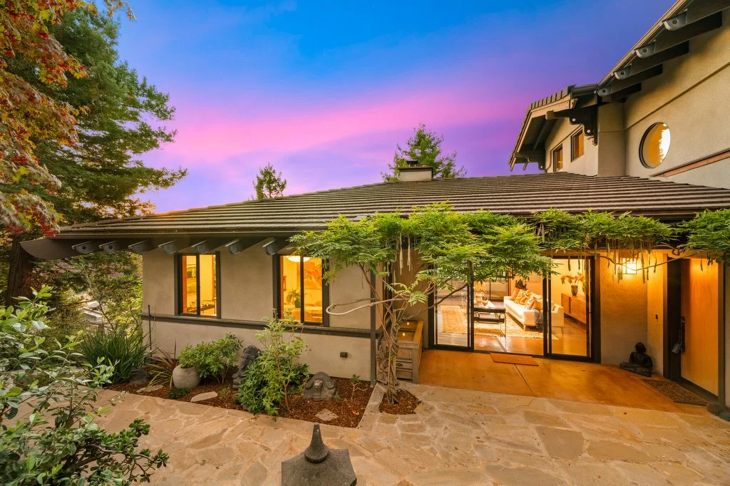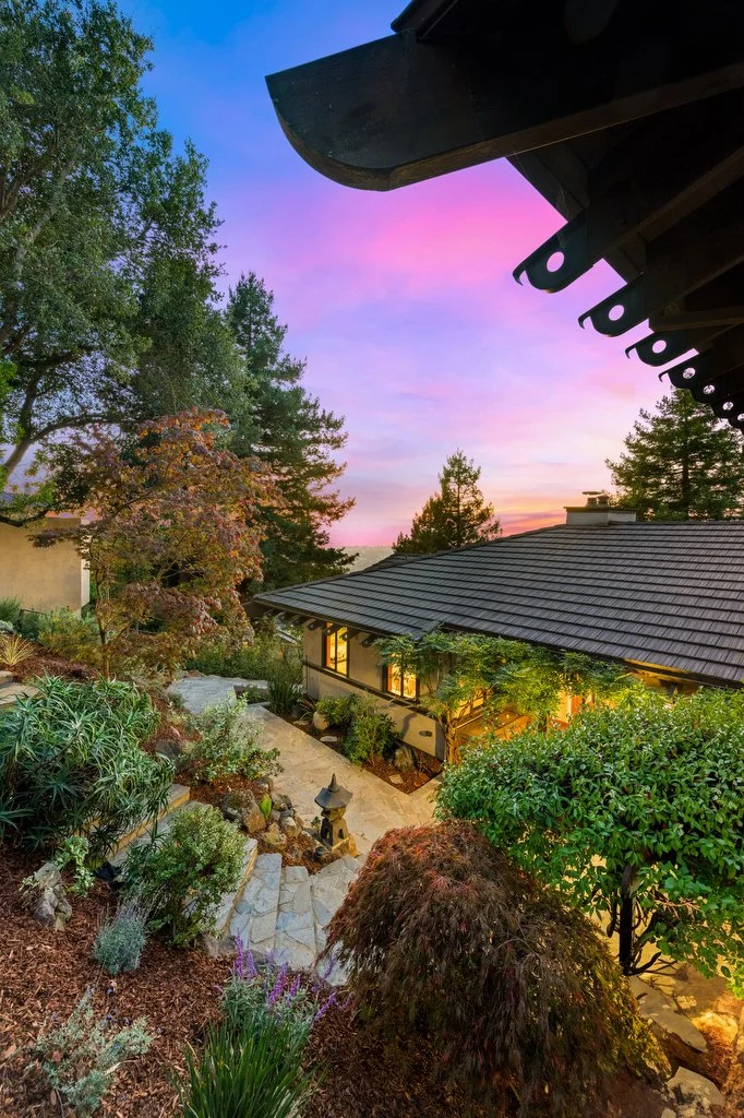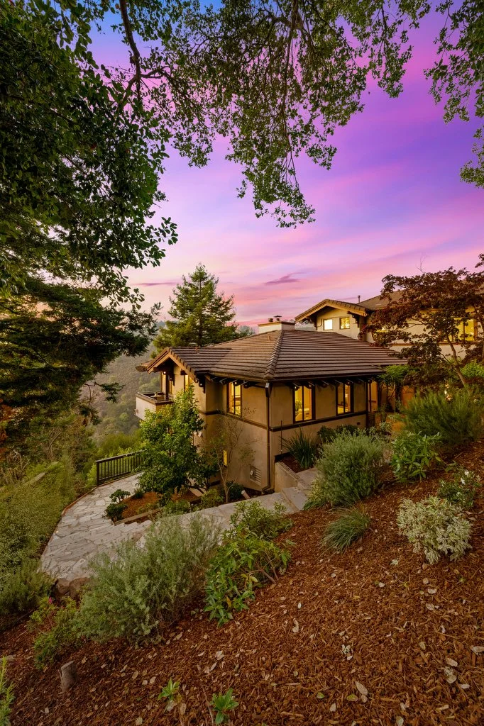 Residential house with stone pathway, paved steps, surrounded by trees and greenery, sunset sky with purple and pink hues. View fullsize