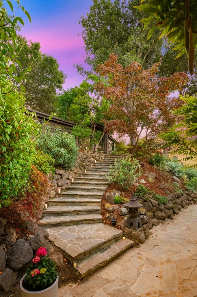 Stone staircase leading up a landscaped garden with trees, plants, and a Japanese-style lantern, under a pink and purple sky.