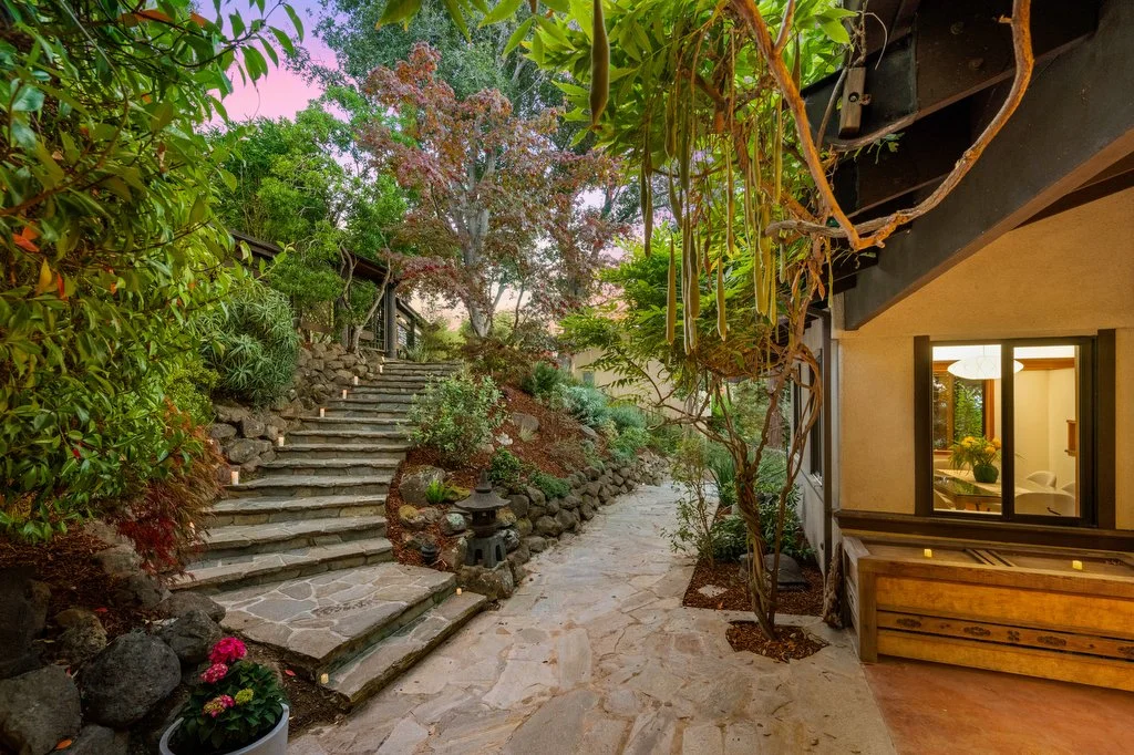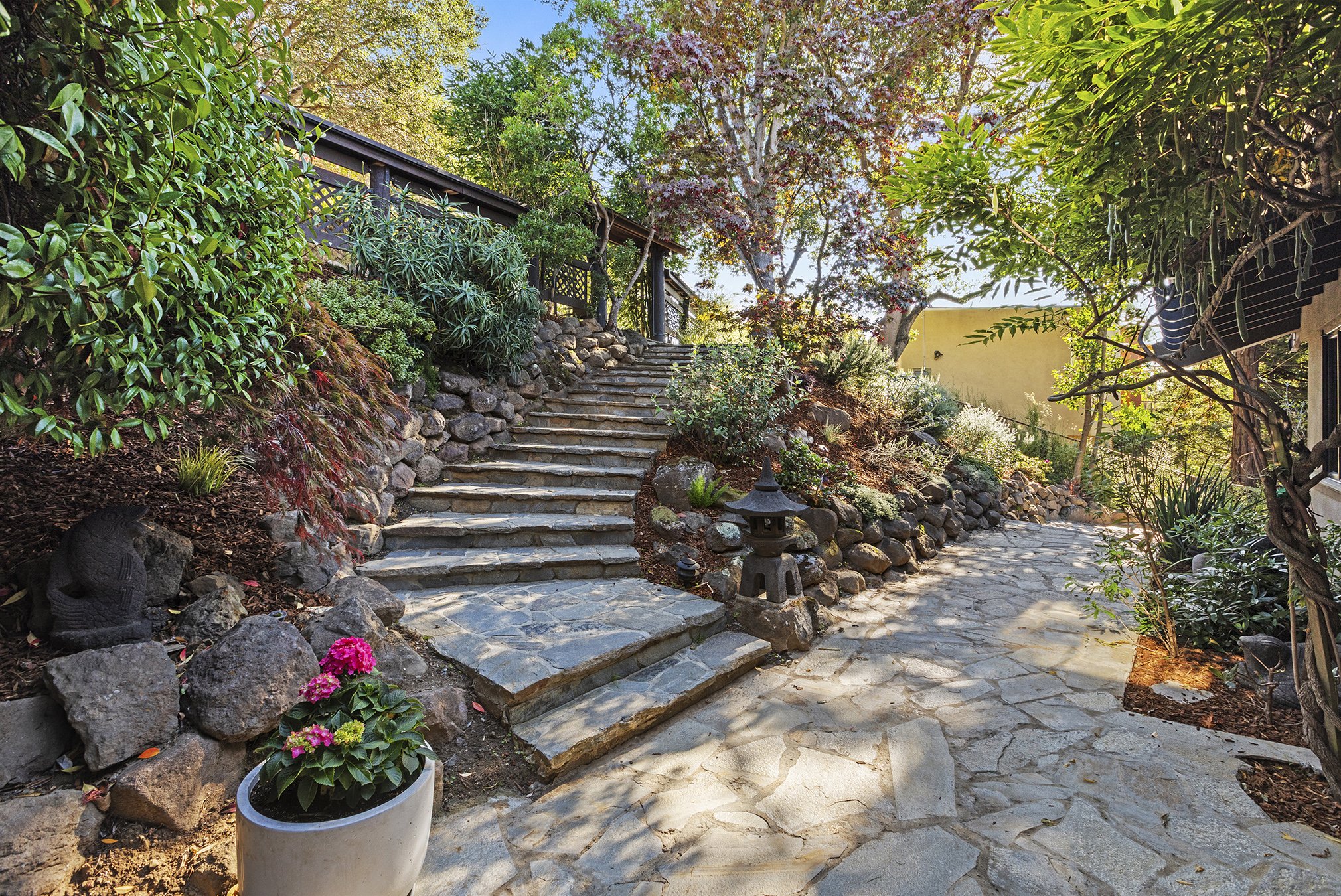 A landscaped backyard with stone stairs leading to an upper level, surrounded by lush greenery, colorful plants, and decorative garden ornaments, with a pathway on the right and a house on the right side.