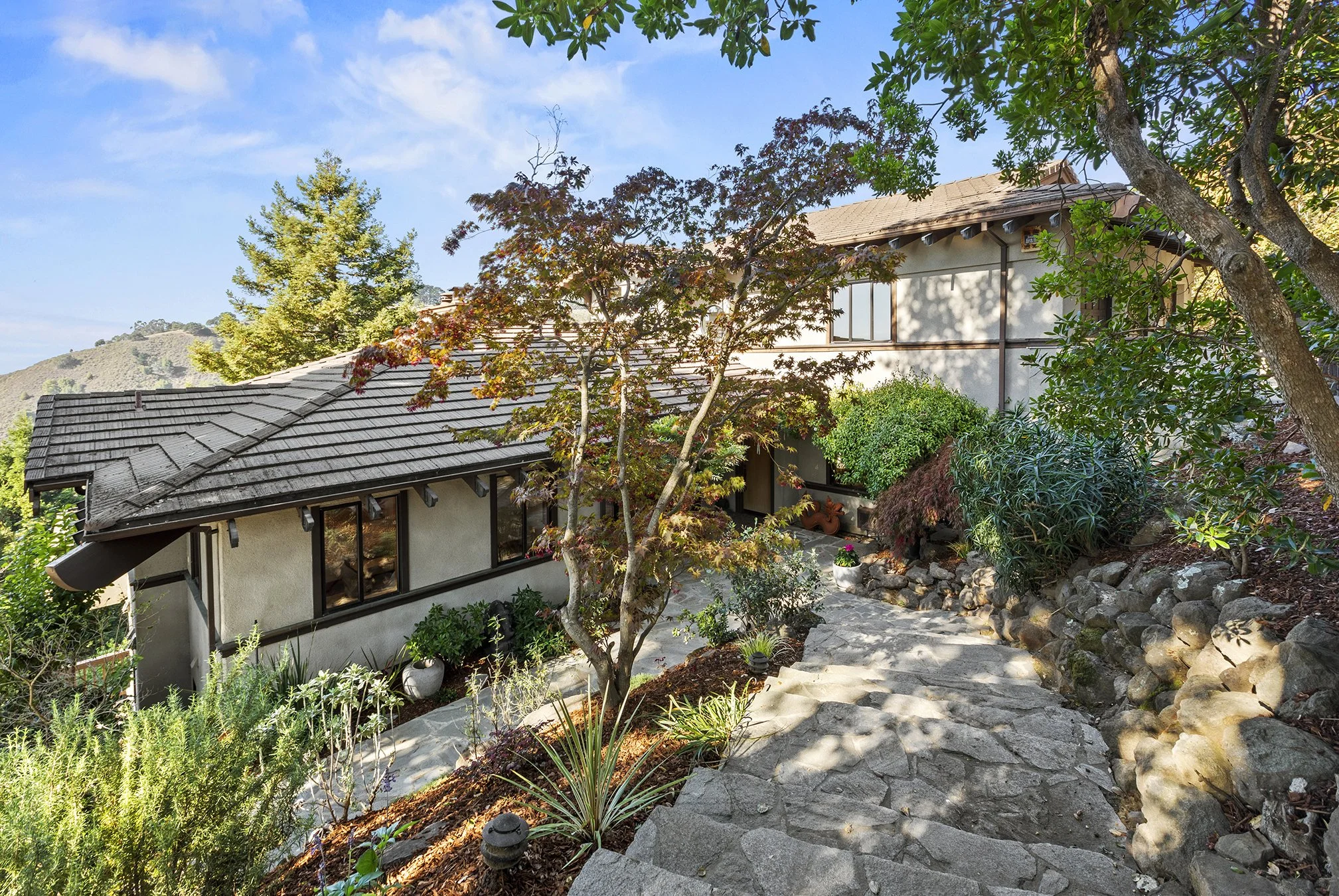 A view of a residential house on a hillside with a stone pathway, surrounded by trees, shrubs, and decorative plants under a partly cloudy sky.
